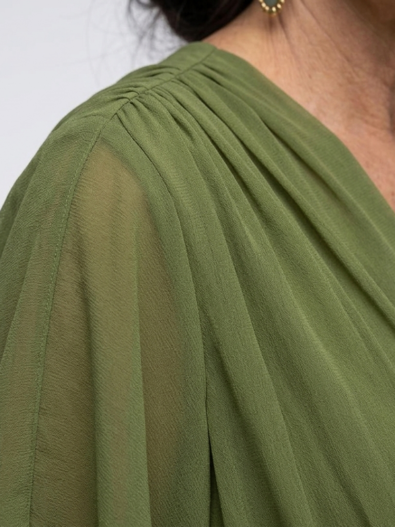 This dress features a soft draped bodice with a defined waist tie and a flowing skirt. The fabric is light and airy, offering ease of movement and comfort throughout the day. It fits well for everyday wear, gatherings, or more dressed occasions.
